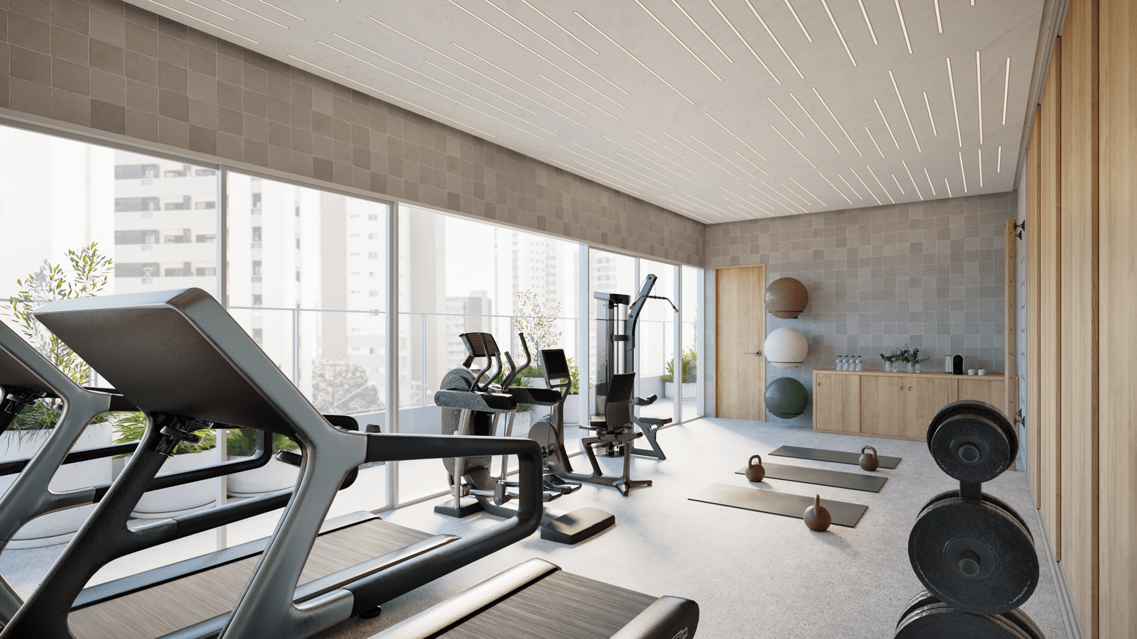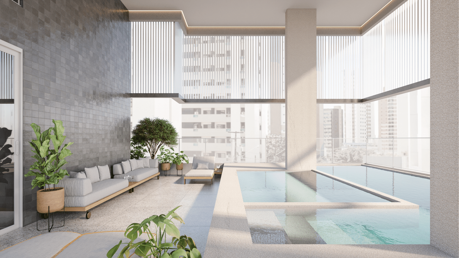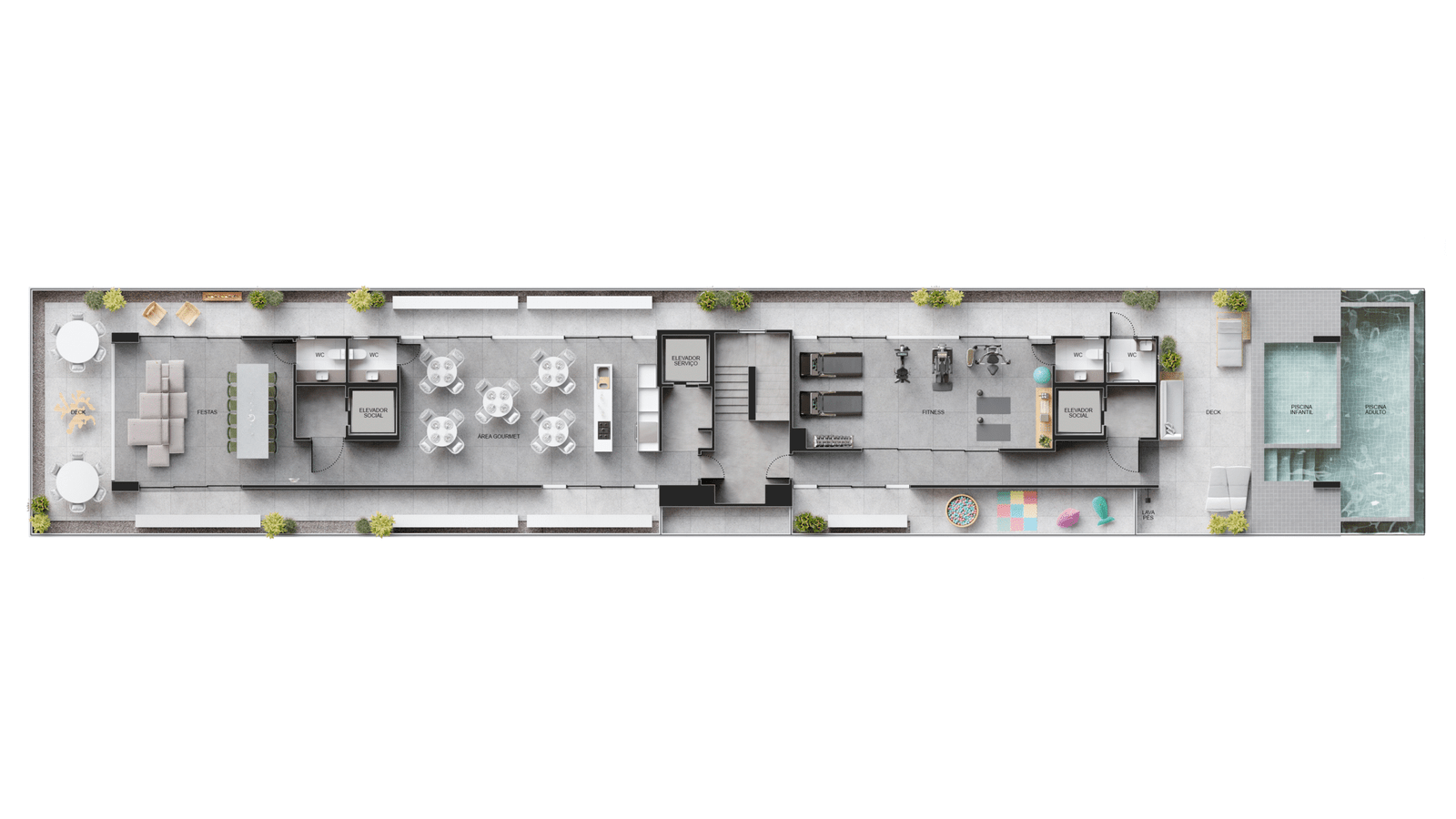 Piscina adulto, piscina infantil, deck molhado, solarium, academia, sauna úmida, descanso da sauna, salão de festas, espaço gourmet, salão de jogos, playground, brinquedoteca, área de convivência, pet place, coworking, espaço delivery.