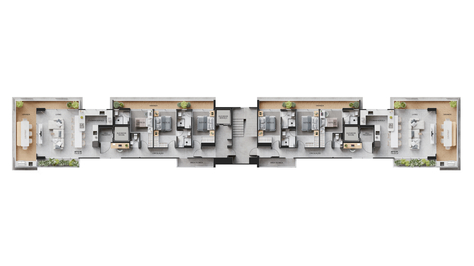 • Exclusividade: Apenas 2 apartamentos por andar, com hall social e elevador privativo.