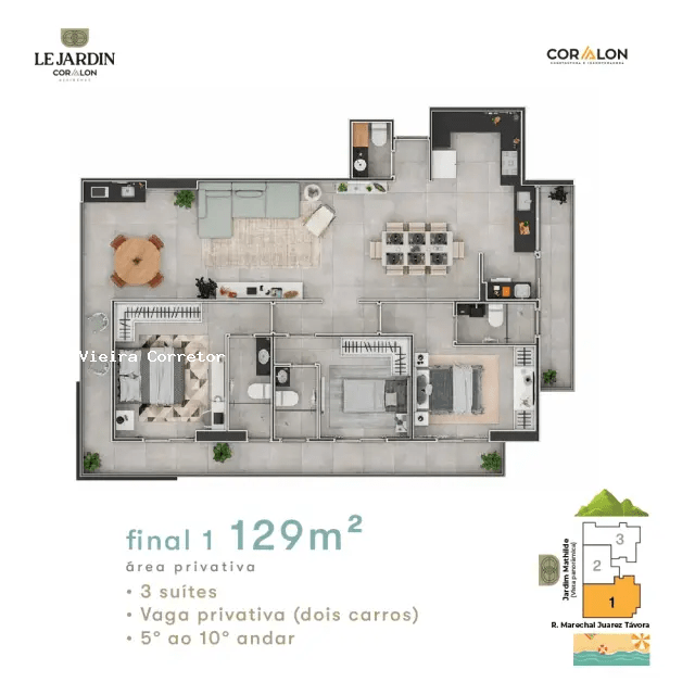 Rua Marechal Juarez Távora, 134 – Canto do Forte – Praia Grande/SP Residencial Le Jardin Coralon Uma experiência panorâmica exclusiva no coração do Canto do Forte. O Le Jardin Coralon é um empreendimento de alto padrão que redefine o conceito de viver bem em Praia Grande. Localizado na área mais nobre e desejada da cidade — o Jardim Mathilde, no Canto do Forte —, o projeto foi concebido para oferecer uma vista privilegiada e permanente, alcançando o Morro do Xixová e o mar, com a vantagem de estar a apenas 350 metros da orla. Com uma arquitetura que prioriza a ventilação e a iluminação natural, as unidades foram desenhadas para proporcionar conforto absoluto. O empreendimento destaca-se pelas suas plantas generosas, que variam de 76m² a 297m², atendendo desde casais que buscam sofisticação até grandes famílias que não abrem mão de espaço. Le Jardin Coralon — Onde a natureza e o luxo se encontram. Destaques das Unidades: Tipologia: Apartamentos de 2 ou 3 suítes, além de coberturas exclusivas com até 4 suítes. Varanda Gourmet: Espaço amplo com vista panorâmica para o Jardim Mathilde e o litoral. Vagas de Garagem: De 1 a 3 vagas privativas e marcadas. Privacidade Total: Projeto sem interferências visuais, garantindo uma experiência de moradia única. Lazer Completo (Entregue Equipado e Decorado): Piscinas adulto e infantil (climatizadas), sauna, academia (fitness center) equipada, salão de festas para eventos especiais, salão de jogos, brinquedoteca (espaço kids).
